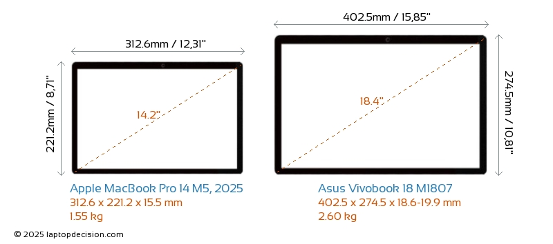 HDMIBeide, MacBook Pro 14 M5, 2025 und Vivobook 18 M1807, verfügen über einen HDMI-Port (1x HDMI 2.1) zum Anschluss an externe Monitore.