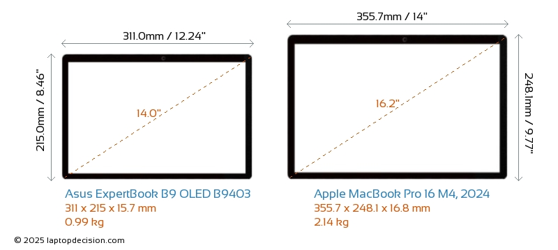 AudioanschlussBeide, ExpertBook B9 OLED B9403 und MacBook Pro 16 M4, 2024, sind mit einem 3,5-mm-Audioanschluss ausgestattet, der eine nahtlose Verbindung zu Kopfhörern und Lautsprechern ermöglicht.