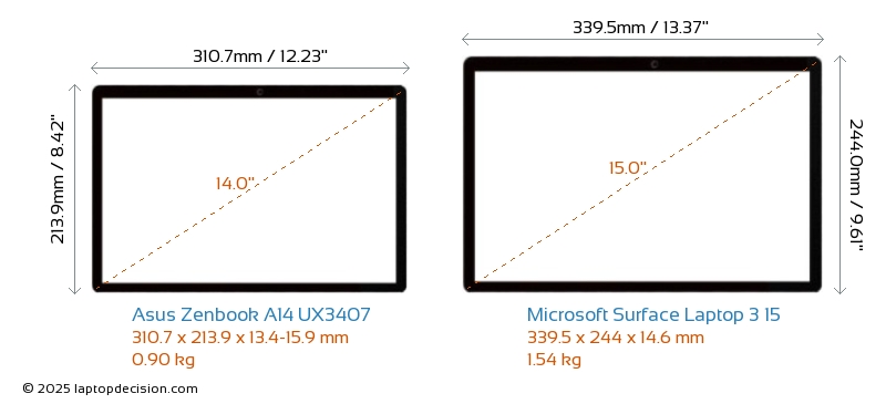 HDMI Zenbook A14 UX3407 verfügt über einen HDMI-Port (1x HDMI 2.1) zum Anschluss an externe Monitore. Surface Laptop 3 15 hat keinen HDMI-Port.