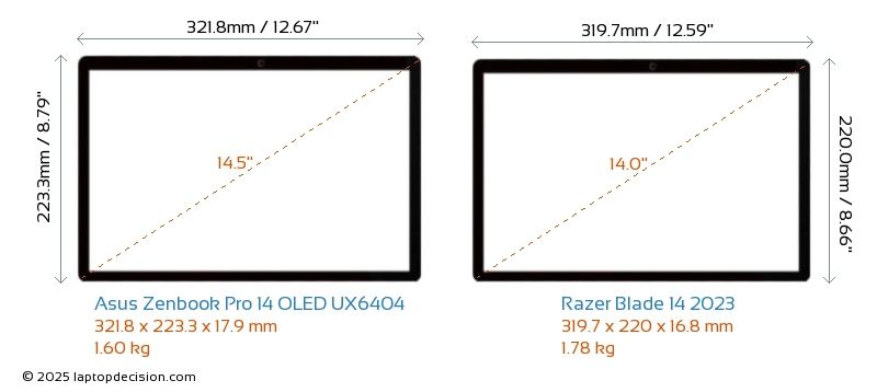 HDMIBeide, Zenbook Pro 14 OLED UX6404 und Blade 14 2023, verfügen über einen HDMI-Port (1x HDMI 2.1) zum Anschluss an externe Monitore.