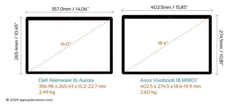 HDMIBeide, Alienware 16 Aurora und Vivobook 18 M1807, verfügen über einen HDMI-Port (1x HDMI 2.1) zum Anschluss an externe Monitore.