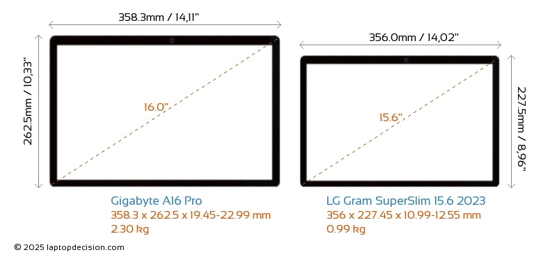 HDMI A16 Pro verfügt über einen HDMI-Port (1x HDMI 2.1) zum Anschluss an externe Monitore. Gram SuperSlim 15.6 2023 hat keinen HDMI-Port.