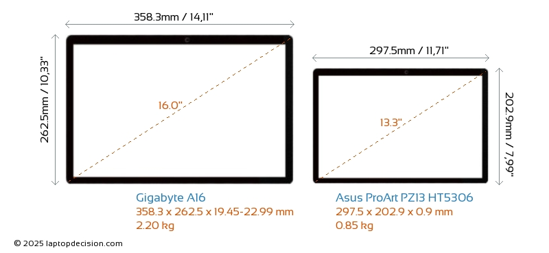 HDMI A16 verfügt über einen HDMI-Port (1x HDMI 2.1) zum Anschluss an externe Monitore. ProArt PZ13 HT5306 hat keinen HDMI-Port.