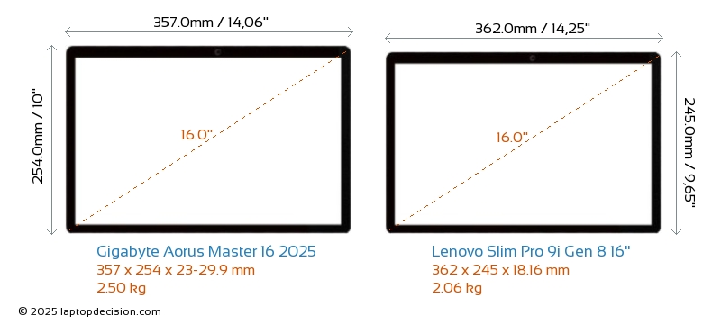 ThunderboltBeide, Aorus Master 16 2025 und Slim Pro 9i Gen 8 16", verfügen über Thunderbolt-Ports. Aorus Master 16 2025 hat Thunderbolt 5, während Slim Pro 9i Gen 8 16" Thunderbolt 4 hat.