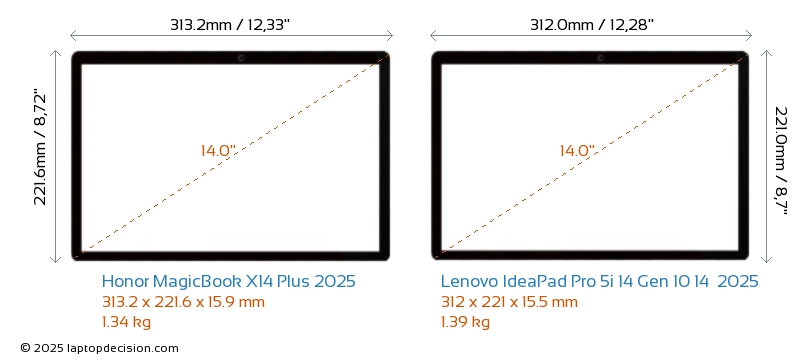 USBBeide MagicBook X14 Plus 2025 und IdeaPad Pro 5i 14 Gen 10 14 2025 verfügen über 2x USB 3.2 USB-A-Ports.Beide MagicBook X14 Plus 2025 und IdeaPad Pro 5i 14 Gen 10 14 2025 verfügen über 2x USB 4.0 USB-Type-C-Ports.