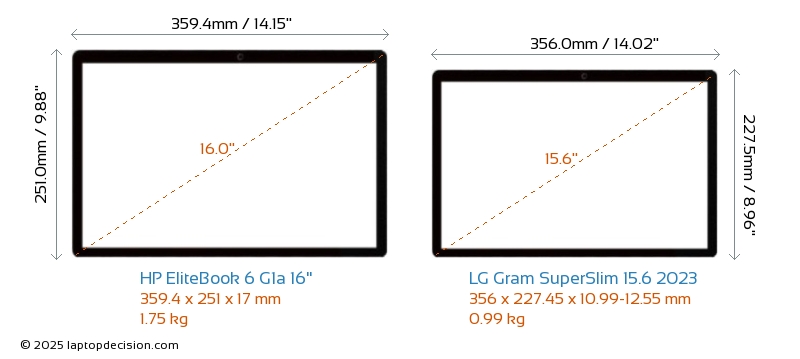 HDMI EliteBook 6 G1a 16" verfügt über einen HDMI-Port (1x HDMI 2.1) zum Anschluss an externe Monitore. Gram SuperSlim 15.6 2023 hat keinen HDMI-Port.