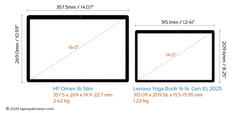 HDMI Omen 16 Slim verfügt über einen HDMI-Port (1x HDMI 2.1) zum Anschluss an externe Monitore. Yoga Book 9i 14 Gen 10, 2025 hat keinen HDMI-Port.