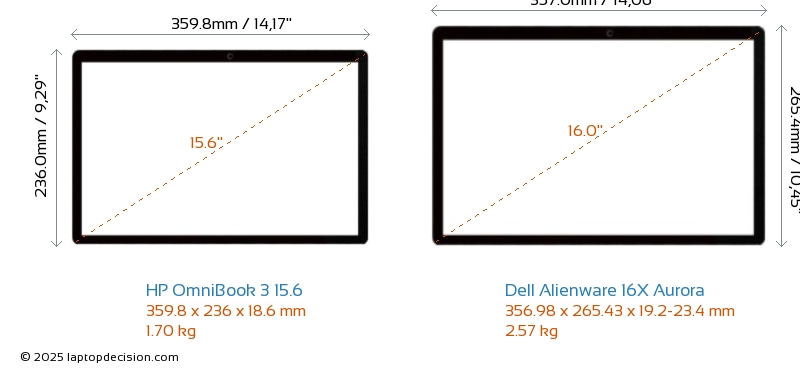 HDMIBeide, OmniBook 3 15.6 und Alienware 16X Aurora, verfügen über einen HDMI-Port. OmniBook 3 15.6 bietet 1x HDMI 1.4, während Alienware 16X Aurora 1x HDMI 2.1 bietet.