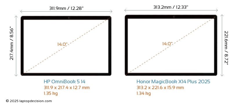 HDMI MagicBook X14 Plus 2025 verfügt über einen HDMI-Port (1x HDMI 1.4) zum Anschluss an externe Monitore. OmniBook 5 14 hat keinen HDMI-Port.