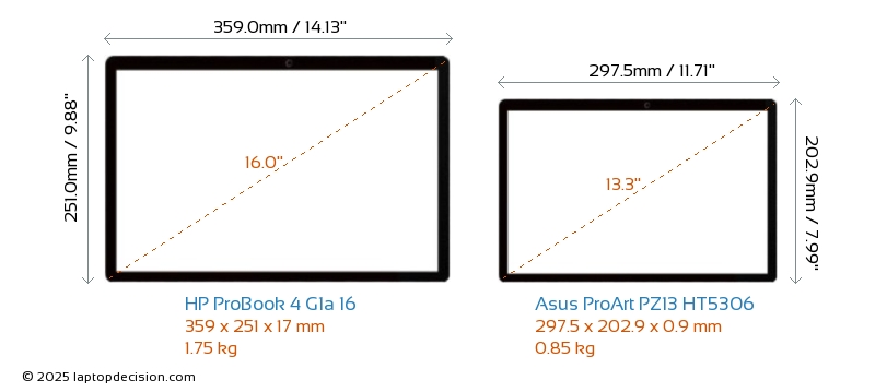 HDMI ProBook 4 G1a 16 verfügt über einen HDMI-Port (1x HDMI 2.1) zum Anschluss an externe Monitore. ProArt PZ13 HT5306 hat keinen HDMI-Port.