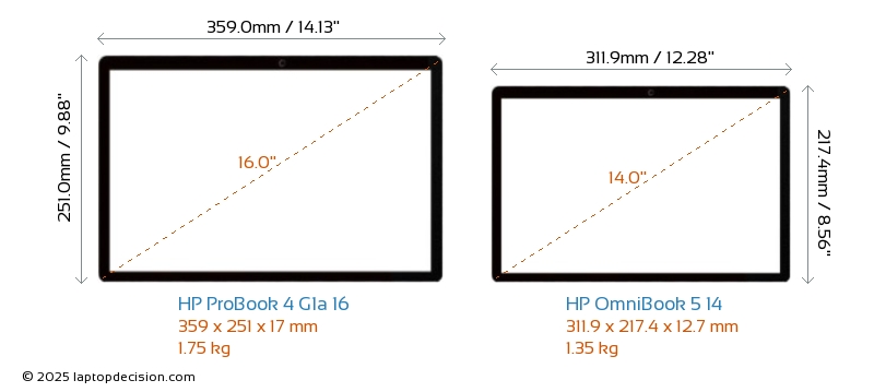 HDMI ProBook 4 G1a 16 verfügt über einen HDMI-Port (1x HDMI 2.1) zum Anschluss an externe Monitore. OmniBook 5 14 hat keinen HDMI-Port.