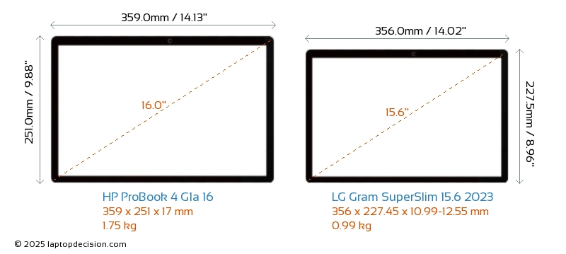 HDMI ProBook 4 G1a 16 verfügt über einen HDMI-Port (1x HDMI 2.1) zum Anschluss an externe Monitore. Gram SuperSlim 15.6 2023 hat keinen HDMI-Port.