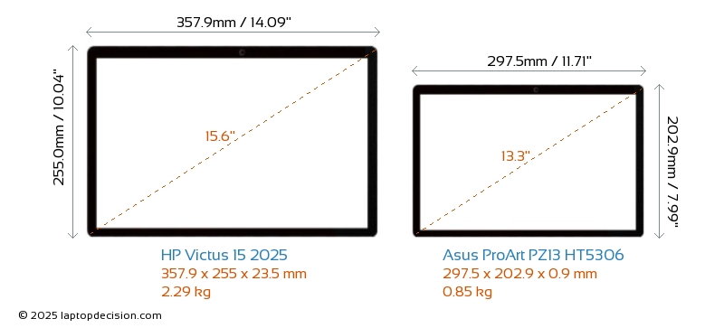 HDMI Victus 15 2025 verfügt über einen HDMI-Port (1x HDMI 2.1) zum Anschluss an externe Monitore. ProArt PZ13 HT5306 hat keinen HDMI-Port.