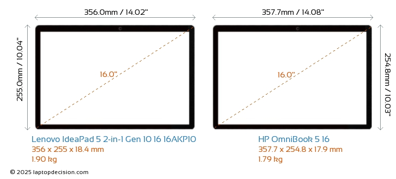 HDMIBeide, IdeaPad 5 2-in-1 Gen 10 16 16AKP10 und OmniBook 5 16 , verfügen über einen HDMI-Port. IdeaPad 5 2-in-1 Gen 10 16 16AKP10 bietet 1x HDMI 1.4, während OmniBook 5 16 1x HDMI 2.1 bietet.