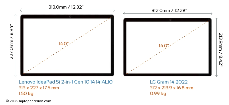 HDMIBeide, IdeaPad 5i 2-in-1 Gen 10 14 14IAL10 und Gram 14 2022, verfügen über einen HDMI-Port. IdeaPad 5i 2-in-1 Gen 10 14 14IAL10 bietet 1x HDMI 1.4, während Gram 14 2022 1x HDMI 2.0 bietet.