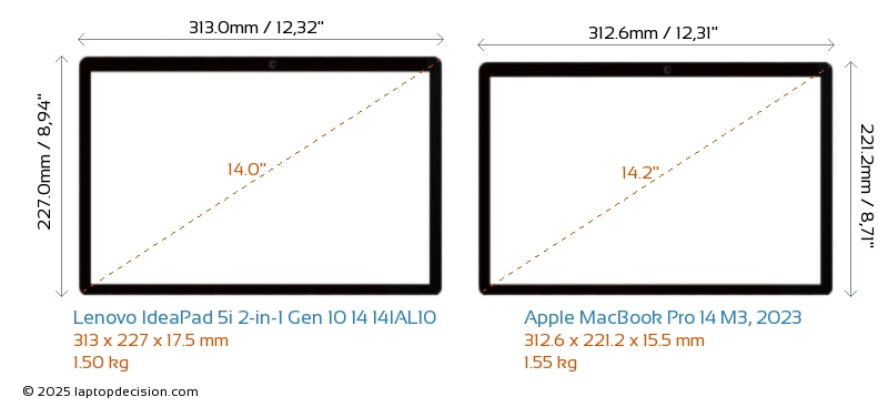 AudioanschlussBeide, IdeaPad 5i 2-in-1 Gen 10 14 14IAL10 und MacBook Pro 14 M3, 2023, sind mit einem 3,5-mm-Audioanschluss ausgestattet, der eine nahtlose Verbindung zu Kopfhörern und Lautsprechern ermöglicht.