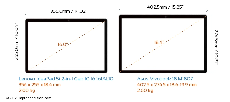 USBBeide IdeaPad 5i 2-in-1 Gen 10 16 16IAL10 und Vivobook 18 M1807 verfügen über 2x USB 3.2 USB-A-Ports.Beide IdeaPad 5i 2-in-1 Gen 10 16 16IAL10 und Vivobook 18 M1807 verfügen über 2x USB 4.0 USB-Type-C-Ports.