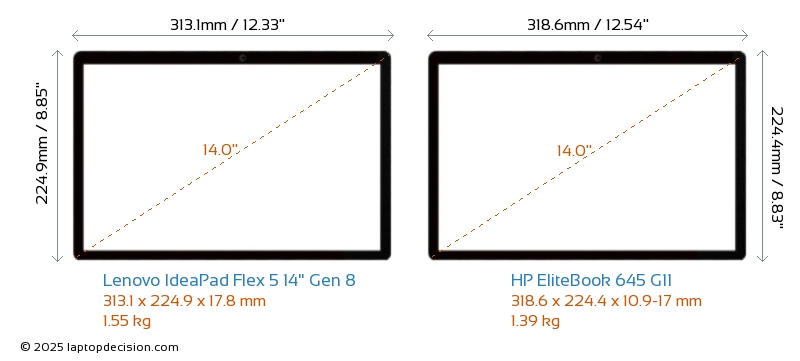 USBBeide IdeaPad Flex 5 14" Gen 8 und EliteBook 645 G11 verfügen über 2x USB 3.2 USB-A-Ports.Beide IdeaPad Flex 5 14" Gen 8 und EliteBook 645 G11 haben USB-Type-C-Ports. IdeaPad Flex 5 14" Gen 8 hat 1x USB 3.2 USB Type-C-Ports, während EliteBook 645 G11 2x USB 4.0 USB Type-C-Ports hat.