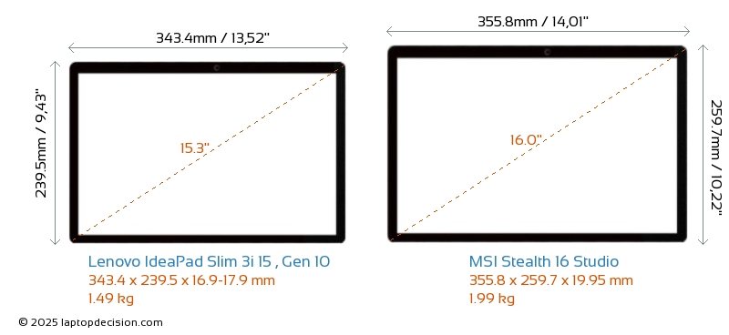 USBBeide IdeaPad Slim 3i 15 , Gen 10 und Stealth 16 Studio haben USB-A-Ports. IdeaPad Slim 3i 15 , Gen 10 hat 2x USB 3.2 USB-A-Ports, während Stealth 16 Studio 1x USB 3.2 USB-A-Ports hat.Beide IdeaPad Slim 3i 15 , Gen 10 und Stealth 16 Studio haben USB-Type-C-Ports. IdeaPad Slim 3i 15 , Gen 10 hat 1x USB 3.2 USB Type-C-Ports, während Stealth 16 Studio 2x USB 3.2 USB Type-C-Ports hat.