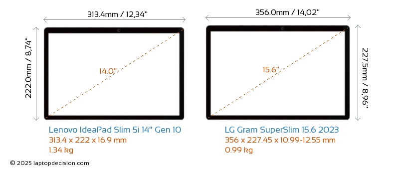 HDMI IdeaPad Slim 5i 14" Gen 10 verfügt über einen HDMI-Port (1x HDMI 1.4) zum Anschluss an externe Monitore. Gram SuperSlim 15.6 2023 hat keinen HDMI-Port.