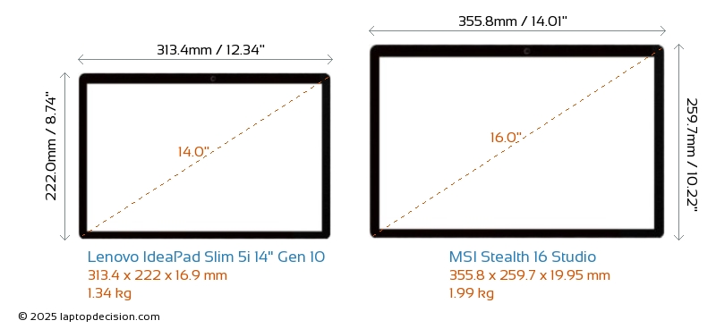 HDMIBeide, IdeaPad Slim 5i 14" Gen 10 und Stealth 16 Studio, verfügen über einen HDMI-Port. IdeaPad Slim 5i 14" Gen 10 bietet 1x HDMI 1.4, während Stealth 16 Studio 1x HDMI 2.1 bietet.