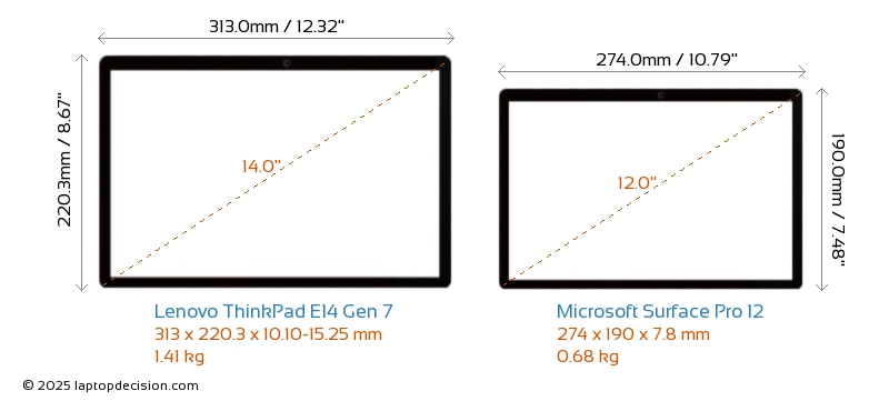 HDMI ThinkPad E14 Gen 7 verfügt über einen HDMI-Port (1x HDMI 2.1) zum Anschluss an externe Monitore. Surface Pro 12 hat keinen HDMI-Port.
