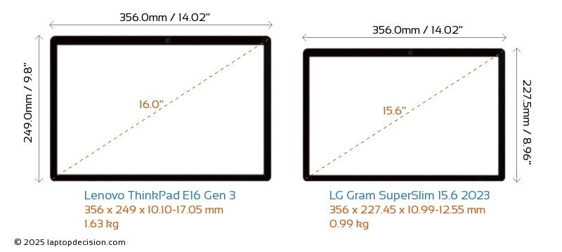 HDMI ThinkPad E16 Gen 3 verfügt über einen HDMI-Port (1x HDMI 2.1) zum Anschluss an externe Monitore. Gram SuperSlim 15.6 2023 hat keinen HDMI-Port.