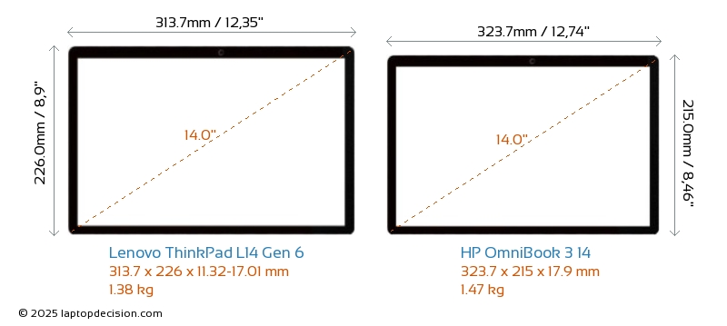 HDMIBeide, ThinkPad L14 Gen 6 und OmniBook 3 14 , verfügen über einen HDMI-Port. ThinkPad L14 Gen 6 bietet 1x HDMI 2.1, während OmniBook 3 14 1x HDMI 1.4 bietet.