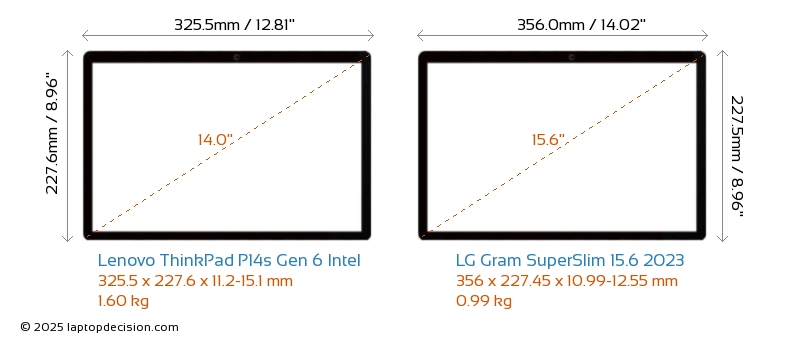 HDMI ThinkPad P14s Gen 6 Intel verfügt über einen HDMI-Port (1x HDMI 2.1) zum Anschluss an externe Monitore. Gram SuperSlim 15.6 2023 hat keinen HDMI-Port.