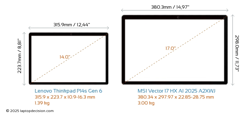 ThunderboltBeide, Thinkpad P14s Gen 6 und Vector 17 HX AI 2025 A2XWJ, verfügen über Thunderbolt-Ports. Thinkpad P14s Gen 6 hat Thunderbolt 4, während Vector 17 HX AI 2025 A2XWJ Thunderbolt 5 hat.