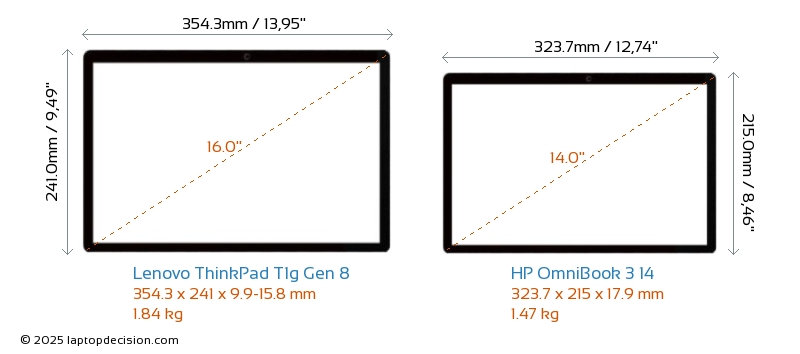HDMIBeide, ThinkPad T1g Gen 8 und OmniBook 3 14 , verfügen über einen HDMI-Port. ThinkPad T1g Gen 8 bietet 1x HDMI 2.1, während OmniBook 3 14 1x HDMI 1.4 bietet.