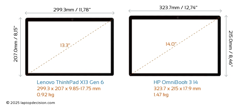 HDMIBeide, ThinkPad X13 Gen 6 und OmniBook 3 14 , verfügen über einen HDMI-Port. ThinkPad X13 Gen 6 bietet 1x HDMI 2.1, während OmniBook 3 14 1x HDMI 1.4 bietet.