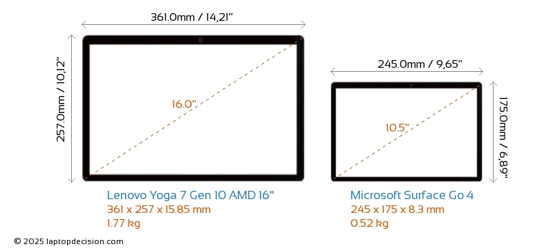 HDMI Yoga 7 Gen 10 AMD 16" verfügt über einen HDMI-Port (1x HDMI 1.4) zum Anschluss an externe Monitore. Surface Go 4 hat keinen HDMI-Port.