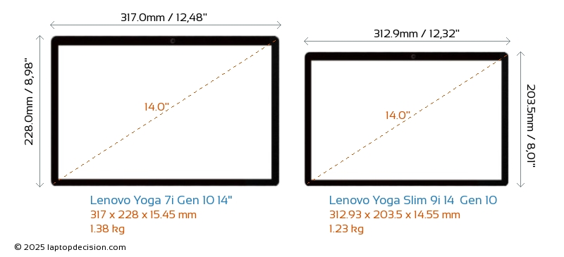 HDMI Yoga 7i Gen 10 14" verfügt über einen HDMI-Port (1x HDMI 1.4) zum Anschluss an externe Monitore. Yoga Slim 9i 14 Gen 10 hat keinen HDMI-Port.