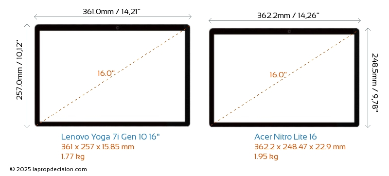 Wifi Yoga 7i Gen 10 16" bietet einen fortschrittlicheren Wi-Fi-Standard v7, was schnellere und zuverlässigere drahtlose Verbindungen im Vergleich zu Nitro Lite 16 (v6) ermöglicht.