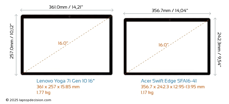 Thunderbolt Yoga 7i Gen 10 16" ist mit einem Thunderbolt 4-Port ausgestattet. Swift Edge SFA16-41 hat keinen Thunderbolt-Port.