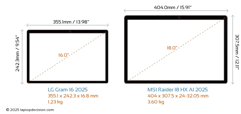 HDMIBeide, Gram 16 2025 und Raider 18 HX AI 2025, verfügen über einen HDMI-Port (1x HDMI 2.1) zum Anschluss an externe Monitore.