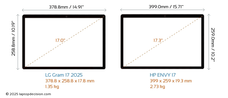 HDMIBeide, Gram 17 2025 und ENVY 17, verfügen über einen HDMI-Port. Gram 17 2025 bietet 1x HDMI 2.1, während ENVY 17 1x HDMI 2.0 bietet.