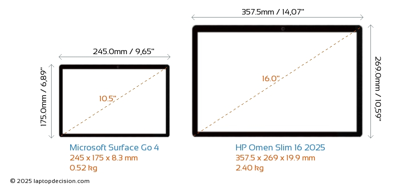 HDMI Omen Slim 16 2025 verfügt über einen HDMI-Port (1x HDMI 2.1) zum Anschluss an externe Monitore. Surface Go 4 hat keinen HDMI-Port.