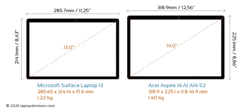HDMI Aspire 14 AI A14-52 verfügt über einen HDMI-Port (1x HDMI 2.1) zum Anschluss an externe Monitore. Surface Laptop 13 hat keinen HDMI-Port.