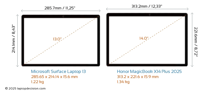 HDMI MagicBook X14 Plus 2025 verfügt über einen HDMI-Port (1x HDMI 1.4) zum Anschluss an externe Monitore. Surface Laptop 13 hat keinen HDMI-Port.