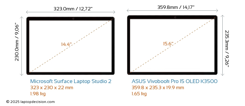 HDMIVivobook Pro 15 OLED K3500 verfügt über einen HDMI-Port (1x HDMI 1.4) zum Anschluss an externe Monitore. Surface Laptop Studio 2 hat keinen HDMI-Port.