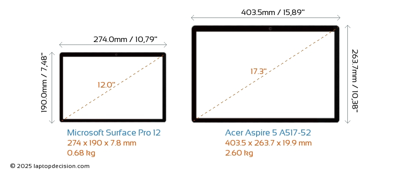 HDMIAspire 5 A517-52 verfügt über einen HDMI-Port (1x HDMI 1.4) zum Anschluss an externe Monitore. Surface Pro 12 hat keinen HDMI-Port.
