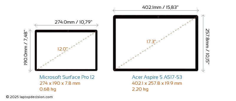 HDMIAspire 5 A517-53 verfügt über einen HDMI-Port (1x HDMI 2.0) zum Anschluss an externe Monitore. Surface Pro 12 hat keinen HDMI-Port.