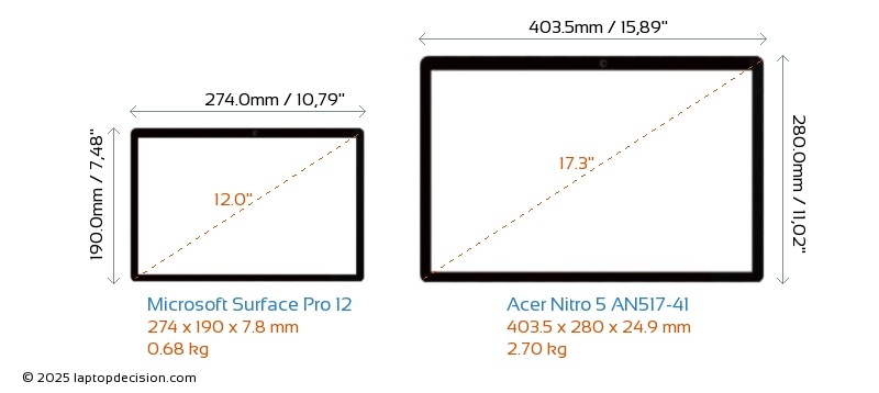 HDMINitro 5 AN517-41 verfügt über einen HDMI-Port (1x HDMI 2.0) zum Anschluss an externe Monitore. Surface Pro 12 hat keinen HDMI-Port.