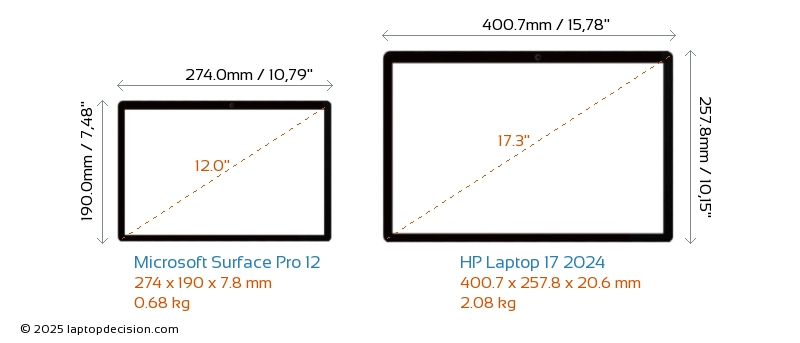 HDMI Laptop 17 2024 verfügt über einen HDMI-Port (1x HDMI 1.4) zum Anschluss an externe Monitore. Surface Pro 12 hat keinen HDMI-Port.