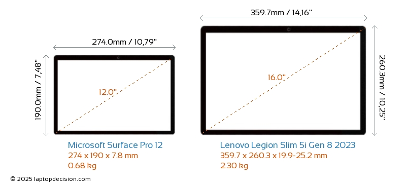 HDMI Legion Slim 5i Gen 8 2023 verfügt über einen HDMI-Port (1x HDMI 2.1) zum Anschluss an externe Monitore. Surface Pro 12 hat keinen HDMI-Port.