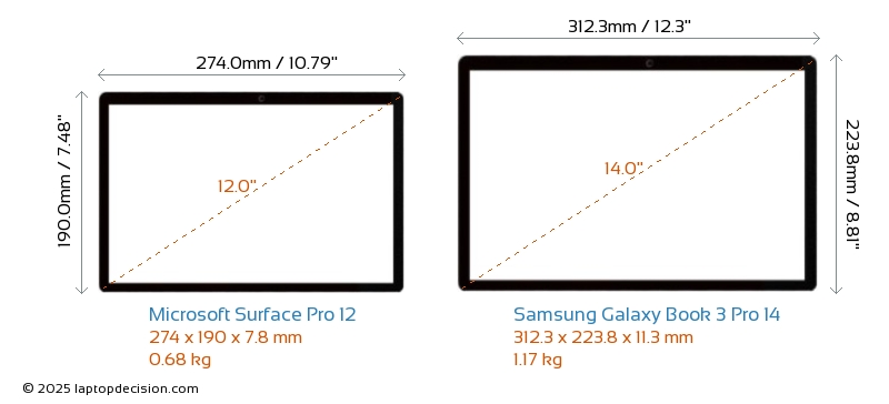 HDMI Galaxy Book 3 Pro 14 verfügt über einen HDMI-Port (1x HDMI 1.4) zum Anschluss an externe Monitore. Surface Pro 12 hat keinen HDMI-Port.
