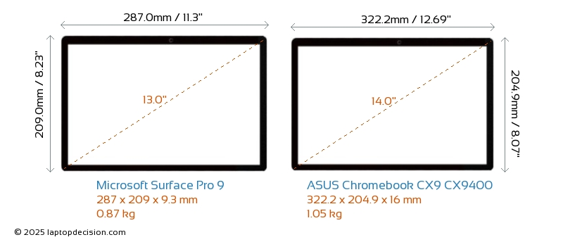 HDMIChromebook CX9 CX9400 verfügt über einen HDMI-Port (1x HDMI 2.0) zum Anschluss an externe Monitore. Surface Pro 9 hat keinen HDMI-Port.