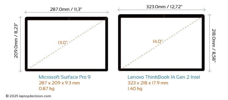 HDMIThinkBook 14 Gen 2 Intel verfügt über einen HDMI-Port (1x HDMI 2.0) zum Anschluss an externe Monitore. Surface Pro 9 hat keinen HDMI-Port.